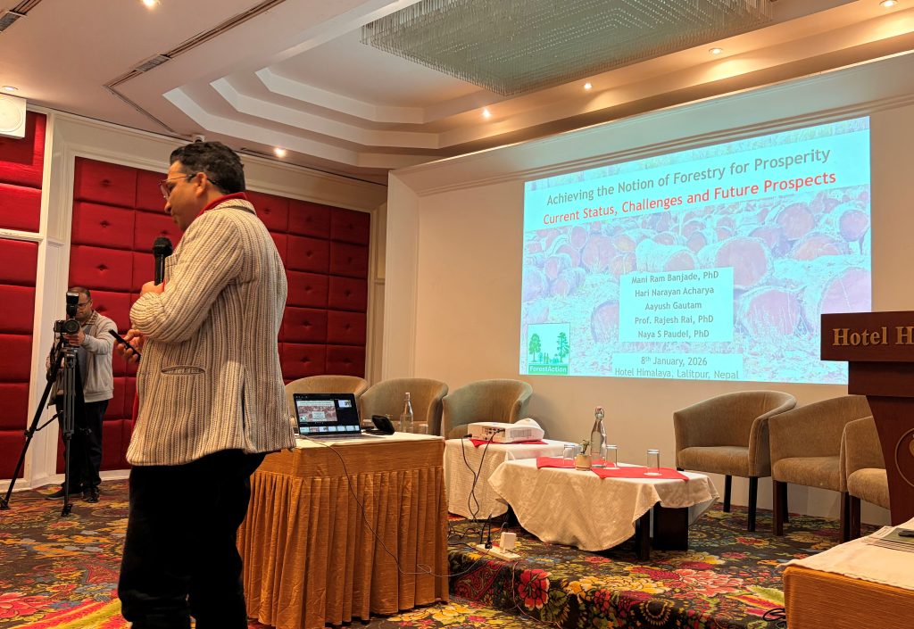 The program was Ban Chautari, organized by ForestAction Nepal (This event was part of the project “Development of Policy Briefs and enhanced communication for Sustainable Forest Management and Green Enterprises in Nepal” under CLARE R4I Opportunities Fund), chaired by Hon. Madhav Chaulagain, Minister of the Ministry of Forests and Environment. The deliberation primarily centered on the presentation delivered by Dr Mani Ram Banjade, that analyzed the forest production data from all Division Forest Offices across Nepal, including annual reports submitted to their monitoring authority, the Provincial Forest Directorate (PFD). The diagnostic study carried out by ForestAction teamdemonstrated a consistent and significant gap between predicted timber production and actual harvest across all forest management regimes. The implication was unambiguous: Nepal is systematically under-realizing the productive potential of its forest resources.